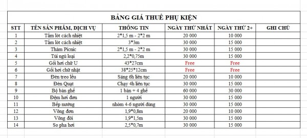BẢNG GIÁ CHO THUÊ PHỤ KIỆN CẮM TRẠI