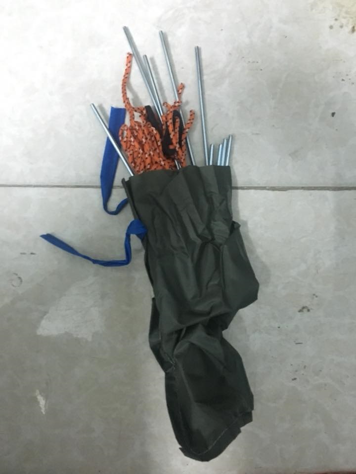 - Bước 2: Từ bó khung lều, các đoạn ngắn đã được nối bởi dây chun ở giữa ống, chúng ta khớp lại thành thanh dài(hai thanh dài cho hai đường chéo) rồi xỏ theo đường ống vải may sẵ trên lều, hoặc móc vào thanh lều này(nếu có móc). Bước này cần chú ý: có thể nhìn hình ảnh lều trước để thấy tổng quan khung lều đi theo đường nào để xỏ. Thường thì loại này chỉ cần xỏ theo hai đường chéo( trừ khi lều lớn hơn 8 người có thể có thêm đường xỏ khác)